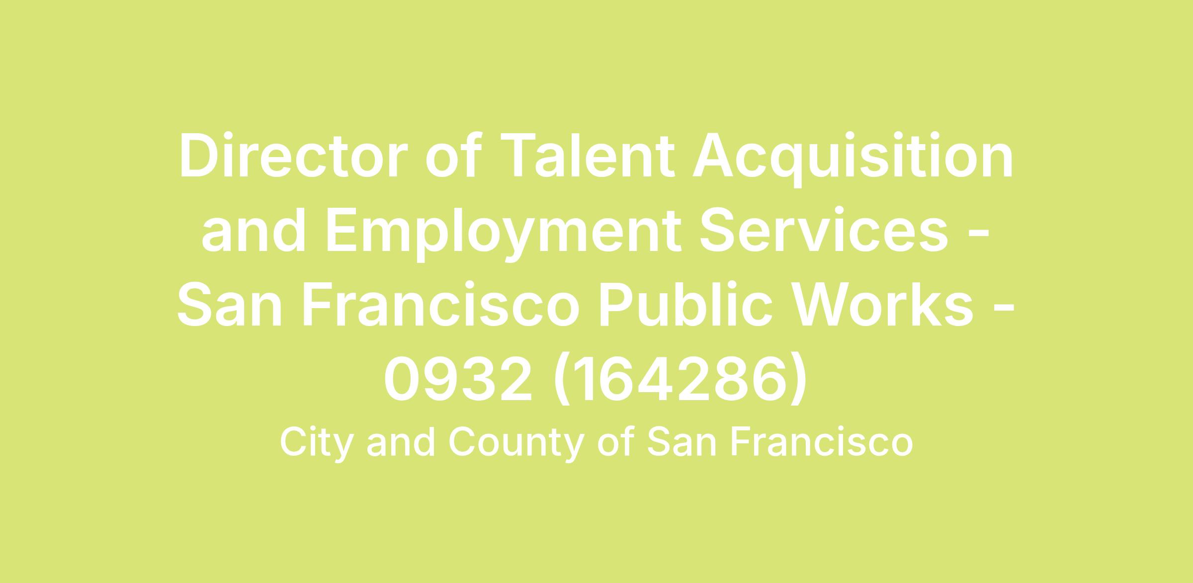 Under general administrative direction from the SFPW Human Resources Director, the Director of Talent Acquisition and Employment Services will develop strategies and work plans, supervise staff, research trends in relevant subject areas to inform and develop future plans, establish standard work, lead projects, and oversee cross-departmental collaboration to the success of different HR teams: Employment Services (HR Operations), Talent Acquisition (Exams)/Classification and Payroll. You will lead an innovative team of HR professionals by providing your expertise on special projects as assigned, many of which require your thoughtful management of sensitive communication with entities such as the City-wide Department of Human Resources, the Civil Service Commission, and other City departments, commissions, and boards on human resources-related matters, as well as compliance with staffing regulations. If you're excited to apply creative and modern approaches to develop solutions and projects to serve the needs of the many communities across San Francisco, you'll be interested in joining our Public Works HR team.