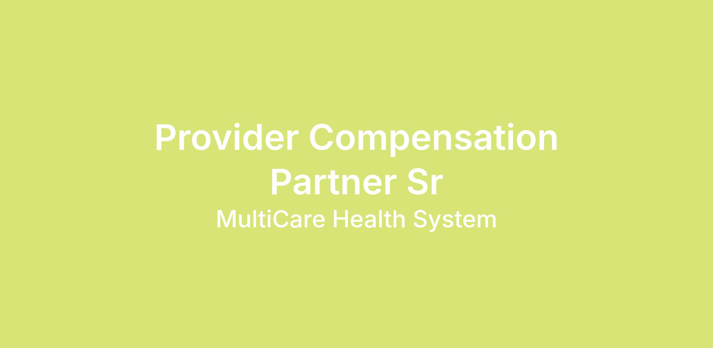 The Senior Provider Compensation Partner is a vital role providing expert consultative subject matter expertise, guidance and analysis at MultiCare Health System. In this position you will work cross-functionally with leadership and human potential on matters related to provider compensation in assigned hospitals and units to help meet business objectives while ensuring internal equity, external competitiveness and compliance with all federal, state and local laws and regulations.Responsibilities